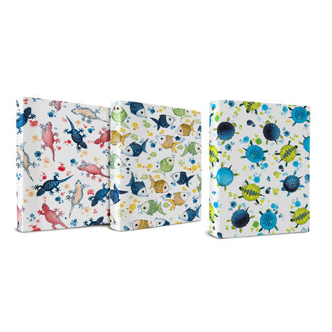 Raccoglitore Icon Sea ad anelli in PP a lastra stampato. Meccanismo con 4 anelli tondi, diametro 25 mm. Tre soggetti assortiti. Dorso 4 cm. Formato contenuto: A4. Formato esterno 25,5 x 32 cm.