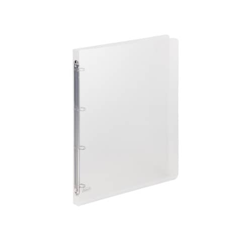 Raccoglitori ad anelli Lumina, realizzati in polipropilene trasparente neutro con speciale finitura rigata. Meccanismo a 4 anelli tondi diametro 15 mm. Formato interno 22×30 cm.