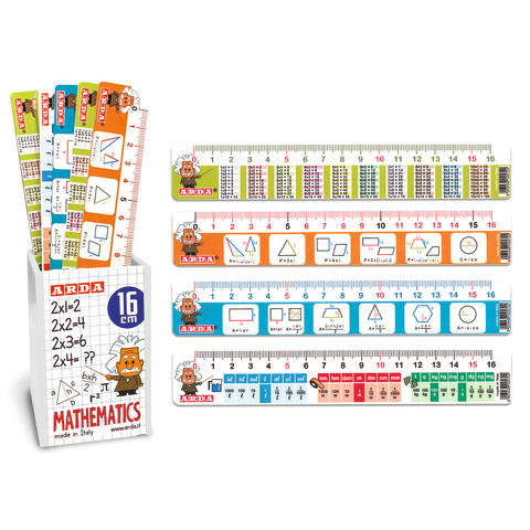 Righelli Arda da 16 cm. Disponibili in barattolo da 24 pezzi assortiti con tabelline, formule geometriche e tabelle conversioni.