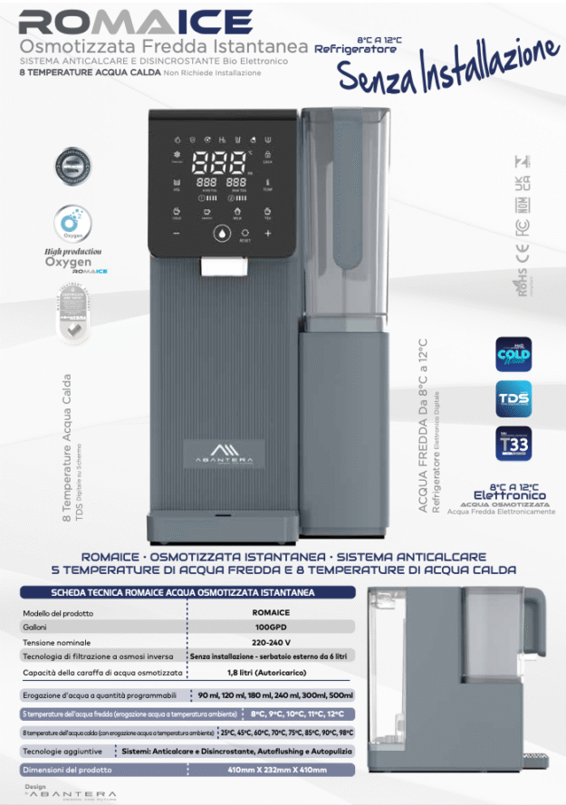 Dispenser elettronico di acqua osmotizzata ROMA ICE di Abantera: offre acqua fredda istantanea a 8 temperature regolabili, con sistema anticalcare e decontaminazione bio-elettronica, senza necessità di installazione.