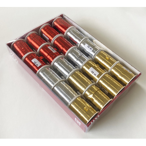 Rotolini di nastro liscio e lucido per il confezionamento di regali. Disponibili in 3 colori (rosso, argento e oro). Formato 10 mm x 10 m. Confezione composta da 20 pezzi.
