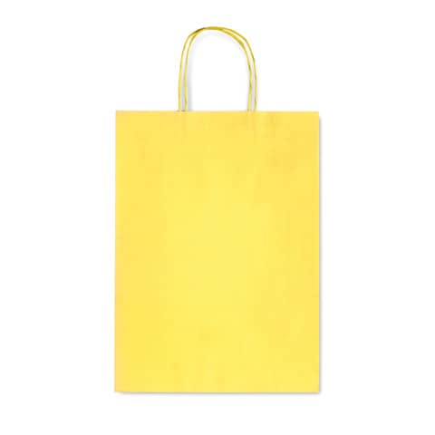 Borse realizzate in carta kraft bianca. Formato: 36 x 12 x 41 cm. Disponibili in colori assortiti a tinta unita. Confezione composta da 25 borse.