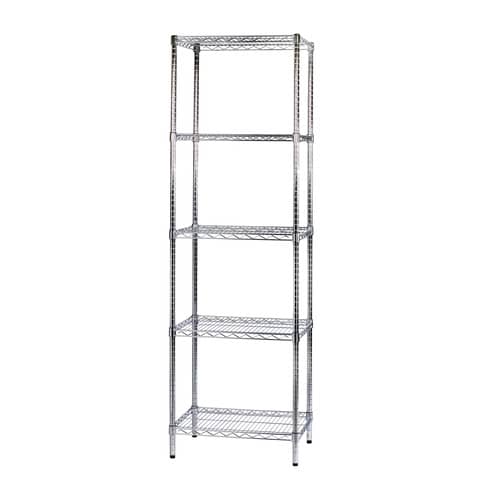 Scaffale in filo d’acciaio cromato completo di guancette per il fissaggio dei ripiani all’altezza desiderata. Tubolari con tappo superiore nero e piedini regolabili. Portata massima ripiani 100 kg. Spessore filo mm 6/4/3/GAP 20. Diametro tubolari 2,54cm. Dimensioni: L.60 x P.45 x H.200 cm. 5 ripiani. Colore acciaio cromato.