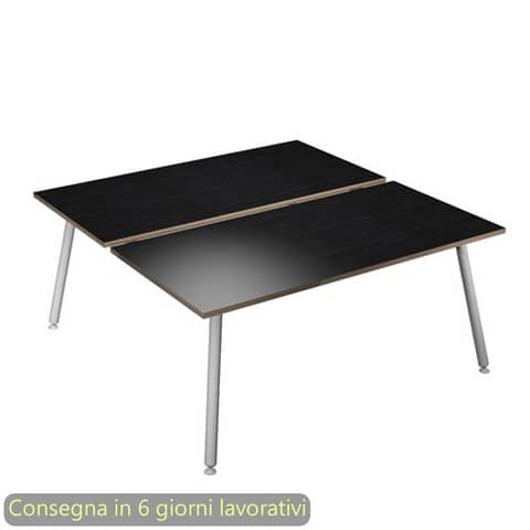 Scrivania con due postazioni contrapposte senza pannello divisorio della linea K67 Skinny Metal, una linea di arredo operativa dal design innovativo e dinamico, caratterizzata da gambe in metallo cilindriche inclinate. L’ideale per l?arredo di open space. Dimensioni L. 120 x P. 166 x H. 74,4 cm. Materiale bilaminato nobilitato melaminico spessore 22 mm conforme norme UNI e EN classe E1. Robusto piano in melaminico sp. 22 mm con bordo antishock resistente agli urti in ABS 2 mm, antigraffio e antiriflesso. Gambe in metallo verniciato bianco (d. 50 mm) complete di piedini livellabili in altezza. Particolarmente stabile e robusta grazie alla struttura rafforzata da quattro travi in metallo di collegamento fra le gambe. Disponibile anche nella versione con le gambe in legno massello al codice … Certificazioni FSC e PEFC. Colore del piano nero venato frassino con bordi rovere.