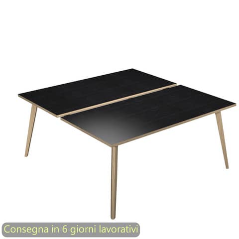 Scrivania con due postazioni contrapposte senza pannello divisorio della linea K143 Woody, una linea di arredo operativa dal design innovativo e dinamico, caratterizzata da gambe in legno massello cilindriche inclinate. L’ideale per l?arredo di open space. Dimensioni L. 180 x P. 166 x H. 74,4 cm. Materiale bilaminato nobilitato melaminico spessore 22 mm conforme norme UNI e EN classe E1. Robusto piano in melaminico sp. 22 mm con bordo antishock resistente agli urti in ABS 2 mm, antigraffio e antiriflesso. Gambe in legno massello (d. 50 mm) complete di piedini livellabili in altezza. Particolarmente stabile e robusta grazie alla struttura rafforzata da quattro travi in metallo di collegamento fra le gambe. Disponibile anche nella versione con le gambe in metallo al codice … Certificazioni FSC e PEFC. Colore del piano nero venato frassino con bordi rovere.
