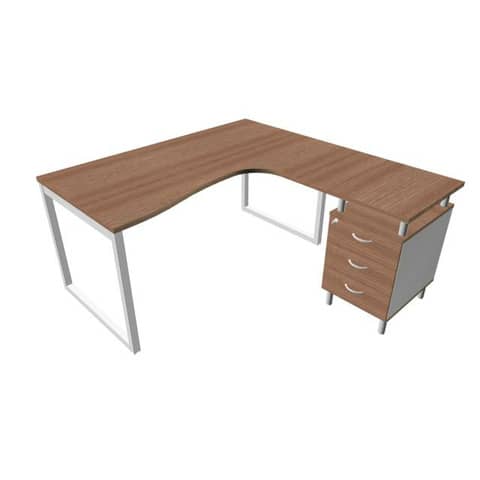 Scrivania con cassettiera a destra piano noce canaletto 160x165xH.75 cm gamba ad anello acciaio argento Practika P2