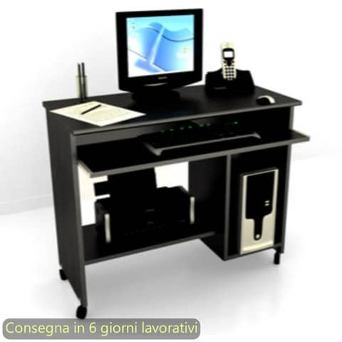 Scrivania su ruote compatta ad ingombro contenuto con 2 ampi vani a giorno ed un ripiano estraibile per la tastiera, ideale per lo Smart Working e l’Home Office. Dimensioni L. 92 x P. 45 x H. 76 cm. Piano sp. 18 mm con bordo antiurto in ABS 1 mm e privo di spigoli vivi. Materiale melaminico bilaminato antigraffio ed antiriflesso conforme alle norme UNI e EN classe E1. Completo di ripiano portatastiera estraibile (L. 86,1 x P. 29 cm spessore 18 mm). Vano a giorno porta CPU (L. 27,4 x P. 33 x H. 52 cm). Piano porta stampante L. 59 x P. 29 cm x H. 40,5 cm dal piano superiore. Dotata di ruote pivottanti. Imballi in alto spessore in cartone riciclato a tutela dell?ambiente. Produzione certificata conforme alle procedure UNI EN ISO 9001. Certificazioni FSC e PEFC. Colore nero venato frassino.