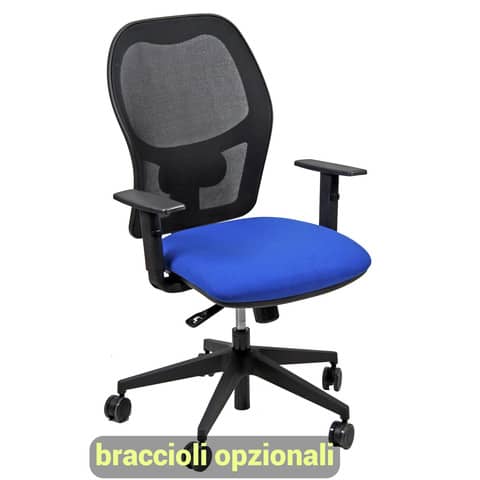 Struttura in acciaio, schienale in Nylon. Rivestimento in tessuto fili di luce, 100% poliestere idrorepellente antimacchia, cucito artigianalmente. Colore blu. Con ruote, braccioli opzionali (codici 110071, 110072, 110074, 110075).