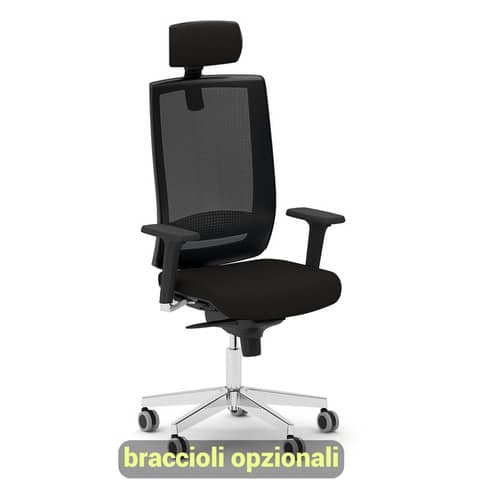Sedia semidirezionale girevole Kind KIPGN, ergonomica con poggiatesta. Schienale con meccanismo a contatto permanente e supporto lombare regolabile, in nylon a rete nero. Seduta con elevazione a gas, meccanismo Synchro con sedile traslabile, antishock. Struttura in faggio multistrato e base in acciaio cromo. Kind – una gamma completa di sedie, dalla direzionale alle sedute interlocutore, per un arredamento integrato anche dei più grandi ambienti.