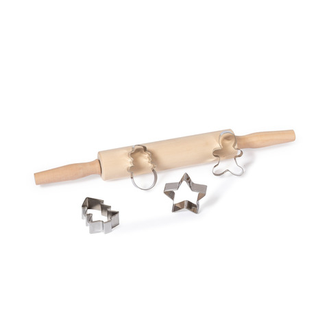Set da forno con stampi natalizi in acciaio inox e mattarello in robusto legno naturale. Include mattarello e 4 stampi a forma di albero di Natale, stella, pupazzo di neve e omino di pan di zenzero. Presentato in una scatola kraft.