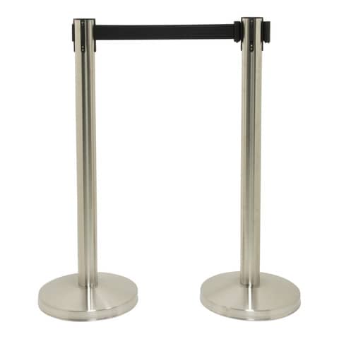 Set di 2 colonne segnapercorso – con nastro retrattile nero di 210 cm. In acciaio inox satinato, 93x33x33 cm, peso 7,9 kg. Ogni colonnina ha 4 diversi punti per l’aggancio del nastro retrattile. adatta sia per uso interno che esterno.