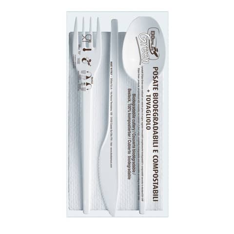 Tris Forchetta, coltello e cucchiaio in ESTABIO. Biopolimero con componente vegetale min. 60% ricavata dalla Barbabietola/canna da zucchero stampata ad iniezione con caratteristiche di robustezza pari a quelle in polistirene. Resistente al calore fino a 70? e smaltibile nella frazione umido. Imbustate con tovagliolo bianco 2 veli 33×33 cm.