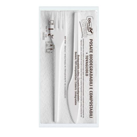 Bis Forchetta e coltello in ESTABIO. Biopolimero con componente vegetale min. 60% ricavata dalla Barbabietola/canna da zucchero stampata ad iniezione con caratteristiche di robustezza pari a quelle in polistirene. Resistente al calore fino a 70? e smaltibile nella frazione umido. Imbustate con tovagliolo bianco 2 veli 33×33 cm.