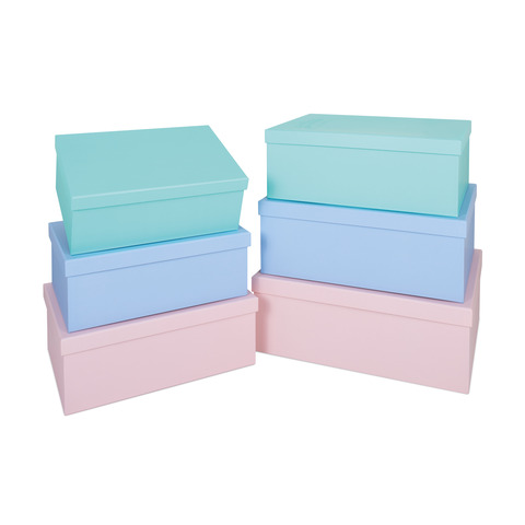 Set composto da 6 robuste scatole in cartone rivestito in carta plastificata opaca. Assortite in 3 colori pastello. Disponibili 6 formati: 29x21x11 cm, 31x25x11,8 cm, 33x24x12,5 cm, 35x26x13 cm, 37x28x13,8 cm, 39x30x14,6 cm.