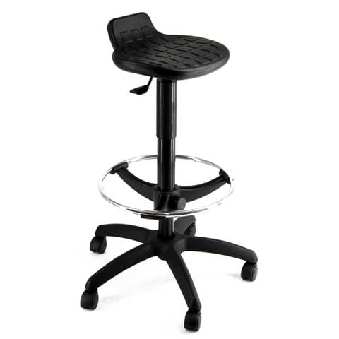 Sgabello tecnico Esos EOE11, senza schienale. Base in nylon, con poggiapiedi telescopico, seduta alta con elevazione a gas in poliuretano integrale autopellante di colore nero, per posizione ?ritto in piedi?.