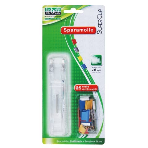 Sparamolle Superclip; blocca fino a 30 fogli; blister completo di 25 molle, colori assortiti. Ricarica molle codici 118728 e 118729