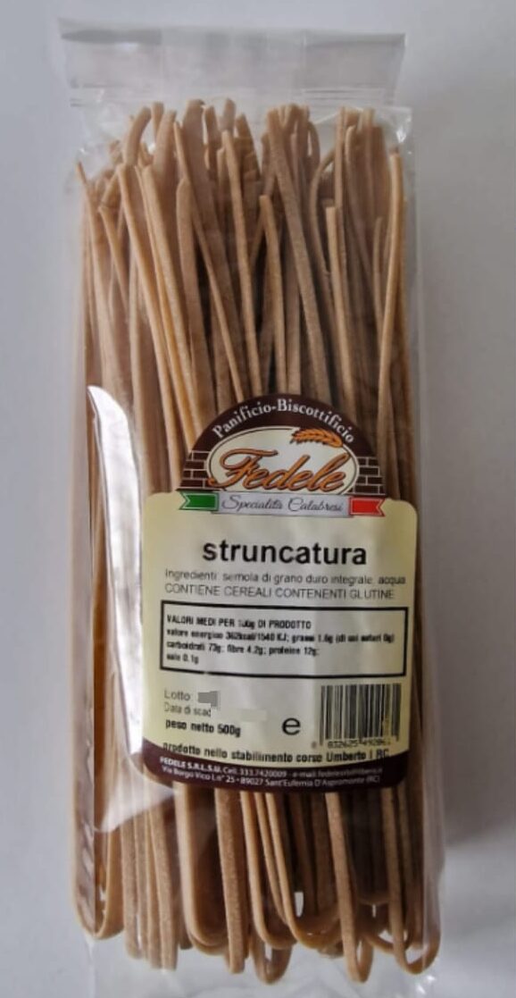 La Struncatura è una pasta tradizionale calabrese, realizzata con ingredienti semplici e genuini: semola di grano duro integrale e acqua. Questo tipo di pasta, con un tempo di cottura di soli 12 minuti, è perfetta per chi cerca un piatto veloce ma ricco di sapore.
