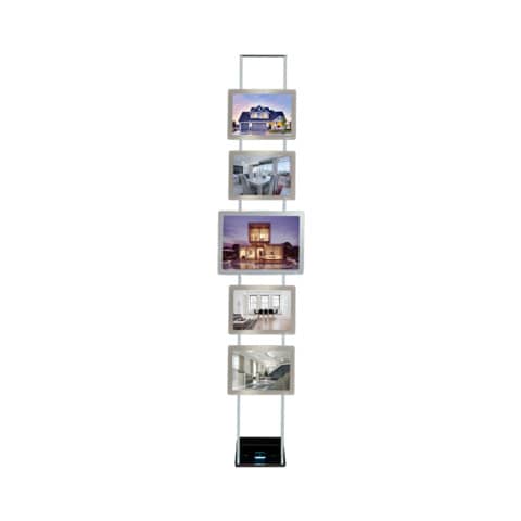 Elegante struttura autoportante in acciaio cromato con 4 cornici magnetiche A4 e 1 cornice A3 retroilluminate a led. Il concetto che contraddistingue questo prodotto – la libertà da ogni tipo di installazione a muro, con cavi o su binari. Per effetto di magneti sul retro, la cornice, calamitata alla struttura, si accende istantaneamente. Le cornici possono essere posizionate sulla struttura sia verticalmente che orizzontalmente su entrambi i lati della struttura per aumentare il numero dei messaggi esposti. Le immagini da inserire all?interno delle cornici sono facilmente sostituibili rimuovendo e riposizionando l?accessorio magnetico in dotazione. Struttura in acciaio cromato Easy LEDMAG 25x40x200 cm. Cornice magnetica LEDMAG formato A4 orizzontale/verticale 34×25 cm. Formato A3 orizzontale/verticale 34×47 cm. Trasformatore da 50w 24v.