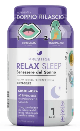 Scopri SUPERGELÈE Relax Sleep, il tuo alleato per un sonno profondo e riposante! Questo integratore alimentare a base di Melatonina, disponibile in una pratica confezione da 60 supergelée al delizioso gusto mora, è formulato per ridurre il tempo necessario per addormentarsi. Con l’aggiunta di Camomilla per favorire il rilassamento e Vitamina B6 e C per supportare la funzione psicologica, ogni supergelèe offre una soluzione efficace e gustosa per migliorare la qualità del tuo sonno. Prova la tecnologia di doppio assorbimento per risultati immediati e prolungati!