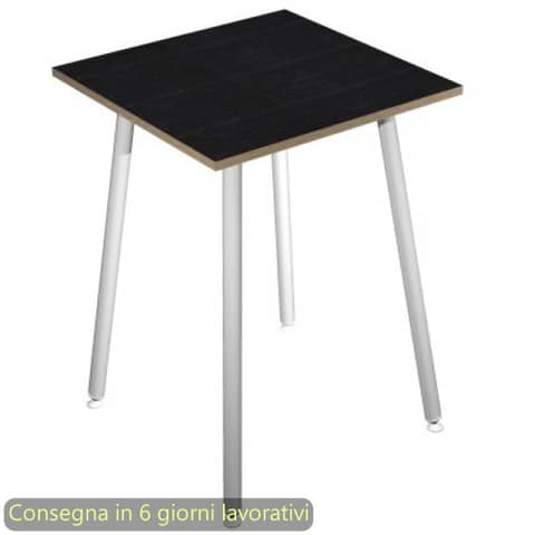 Tavolo alto della linea K67 Skinny Metal, una linea di arredo operativa dal design innovativo e dinamico, caratterizzata da gambe in metallo cilindriche inclinate. L’ideale per l?arredo di punti ristoro e per l?allestimento di postazioni di appoggio per veloci riunioni ed incontri di lavoro. Dimensioni L. 80 x P. 80 x H. 105 cm. Materiale bilaminato nobilitato melaminico spessore 22 mm conforme alle norme UNI e EN classe E1. Robusto piano in melaminico sp. 22 mm con bordo antishock resistente agli urti in ABS 2 mm, antigraffio e antiriflesso. Gambe in metallo verniciato bianco (d. 50 mm) complete di piedini livellabili in altezza. Particolarmente stabile e robusto grazie alla struttura rafforzata da quattro travi in metallo di collegamento fra le gambe. Disponibile anche nella versione con le gambe in legno massello. Certificazioni FSC e PEFC. Colore del piano nero venato frassino con bordo rovere.