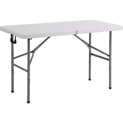 Tavolo rettangolare con piano in polietilene bianco e base in acciaio verniciato nero, con piano e gambe pieghevoli e richiudibile come una valigetta con maniglia. Dimensioni: L122 x P61 x H74 cm.