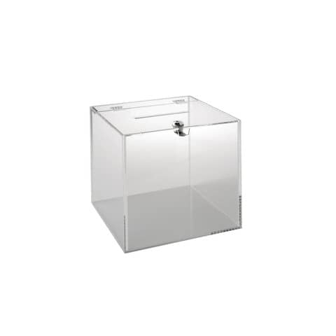 Teca in acrilico trasparente, dotata di fessura sul lato superiore e chiusura di sicurezza con serratura e chiave. Disponibile nel formato 25x25x25 cm, eventuali lavorazioni speciali a richiesta su quantitativi. Fessura 12,5×1 cm.