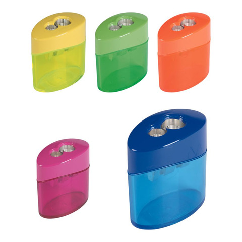 Temperamatite a due fori in metallo Elliptic Swing. Dotato di serbatoio e con temperino in magnesio. Colori frost assortiti. Confezione da 10 pezzi assortita in 2 pezzi per colore : blu, verde, giallo, fucsia e arancio.