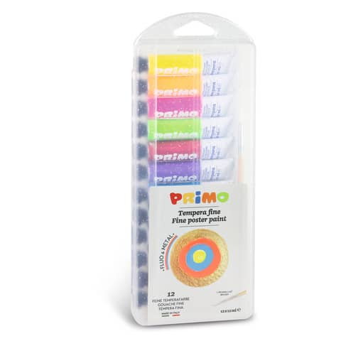 Tempere 12 ml – scatola in polipropilene – 8 tubetti metallizzati, 4 tubetti fluo + 1 pennello Primo assortiti – 450T12FMP