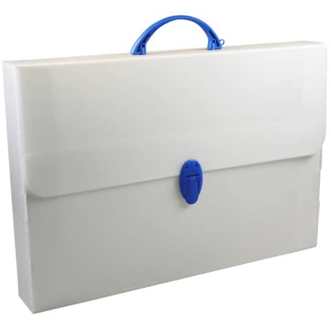 Valigetta da disegno realizzata in polipropilene da 2,5 mm di spessore e 480 g/m². – lavabile e resistente. Ideale per trasportare disegni e documenti in formato A4. Dimensioni: 45,5 x 31 x 6 cm. Dotata di maniglia di trasporto e 1 chiusura di colore blu. Colore bianco.