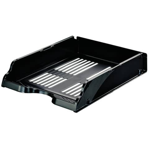 Classica vaschetta da ufficio. Forte e robusta. Sovrapponibile bifrontalmente e lateralmente – dotata di appositi fori per l?applicazione di distanziatori in metallo per aumentarne la capacità . Transit vaschetta portacorrispondenza Colore: nero.